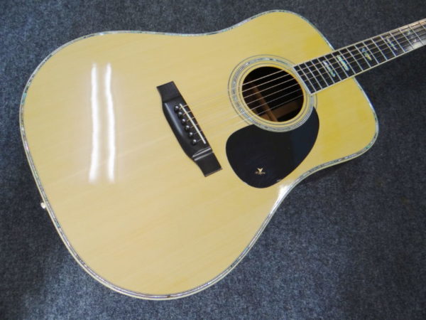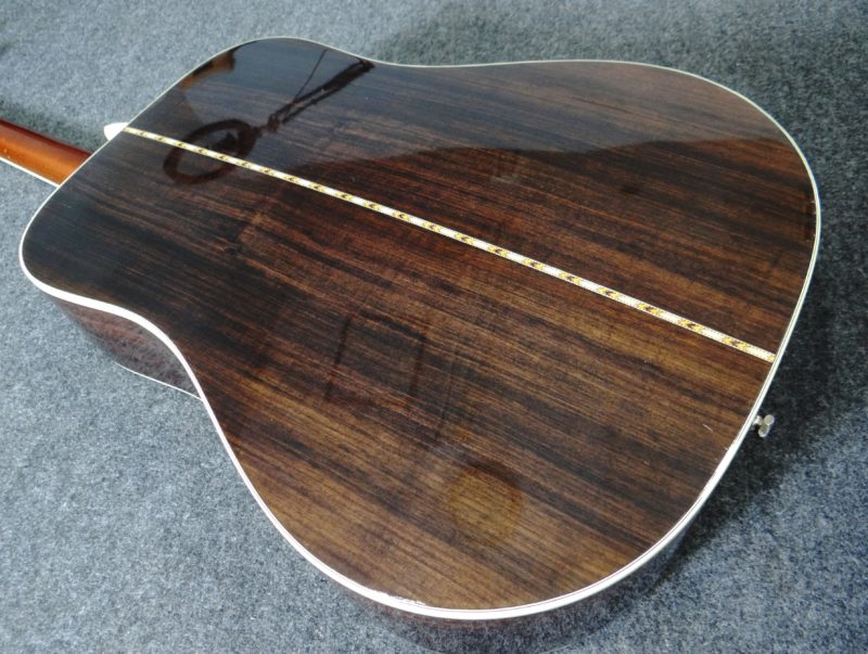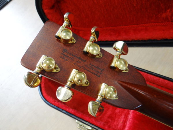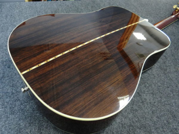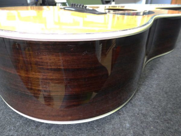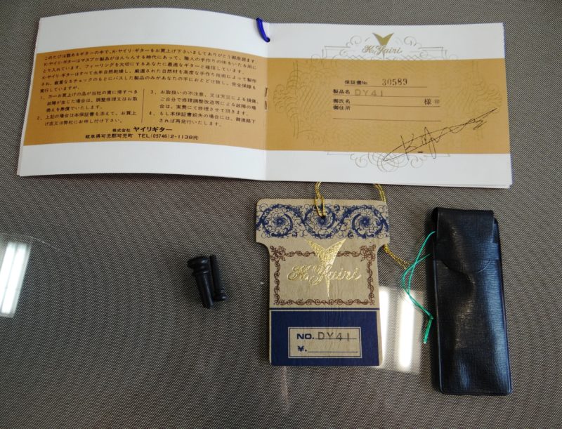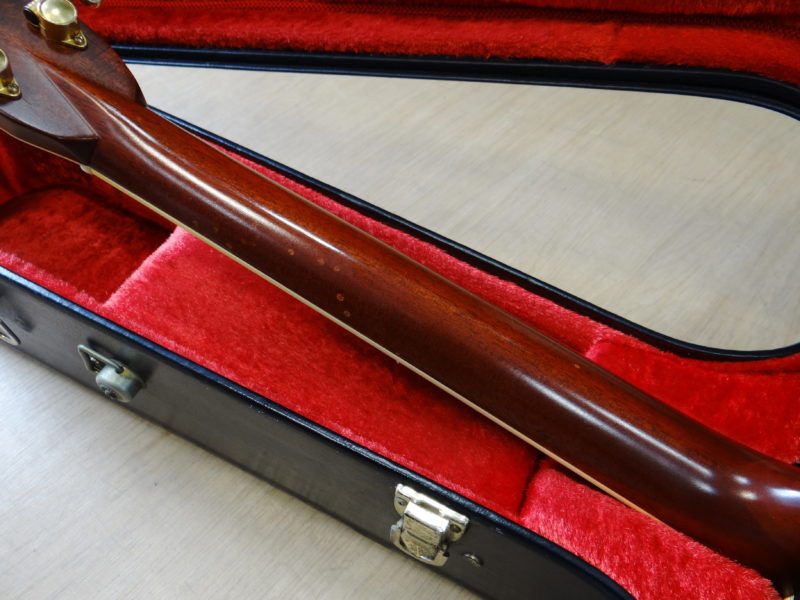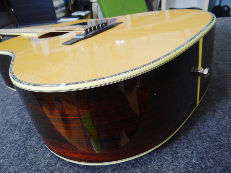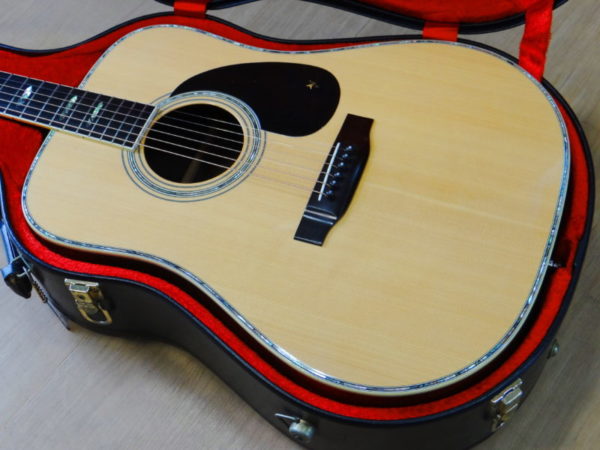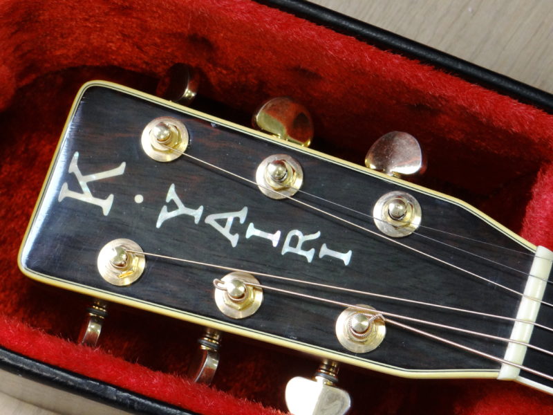 さて問題は鳴りですが「素晴らしい」に尽きます。オリジナルのMartinと同じノーマルブレイシングを採用し(近々のMartinに見られる重度のスキャロップではなく)、程良くボディの乾燥も進み、長年の弾き込みもあり、力強くガッチリとした低音域、暖かさに太さが加わった中音域、そしてMartin D-45より少しエッジが鋭い高音域、立ち上がりの早いサウンドが飛び出して来ます!暫く使用されてなかった様子ですので、弾き込む毎に本格的な鳴りが戻って来ると思われます。パッシブピックアップが取り付けられています。年代物ですが比較的頑丈なヤイリ専用ハードケースが付いてます。