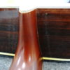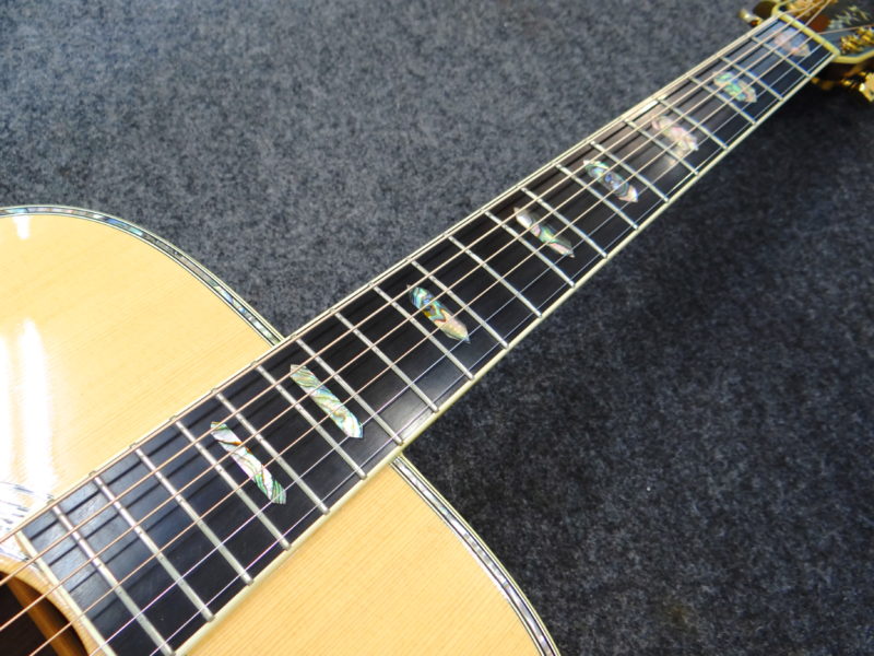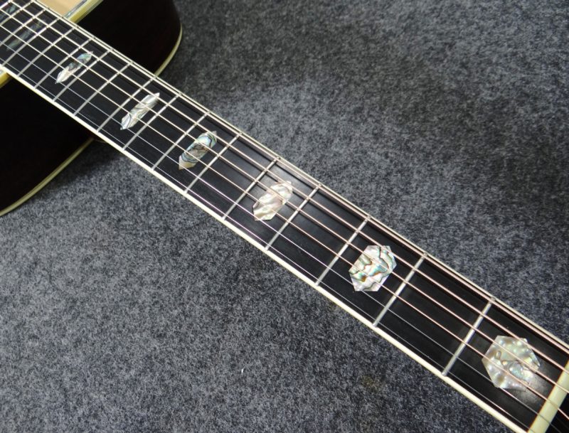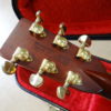 ネックとボディのバインディングに剥がれや補修跡は見られません。ブリッジ剥がれも無く、トップとバックのブレイシングも詳細な点検を行いましたが剥がれは有りません。ペグのオリジナルグローバーゴールドは若干くすみが有りますが動作は良好です。エボニーフィンガーボードの3~5フレット付近には多少の凹みがありますが、全体的なフレット残りは十分で現状でも使用に問題は有りません。勿論、ネック反りも無くロッドにも余裕が有ります。12フレットでの弦高は1弦側で約2mm、6弦側で約2.8mm、サドル調整可能幅は約2~3mmです。