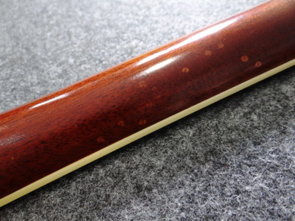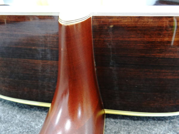 ヘッドのハカランダのツキ板に軽い白濁があり、ネック裏の塗装面には変色斑点、ネックとボディの付け根付近の側板に薄い塗装の変色が有りますが、いずれも気を付けて見なければ分からない程度です。またサイドのソリッドローズウッドにごく小さなヒビが有りましたが修理致しました。